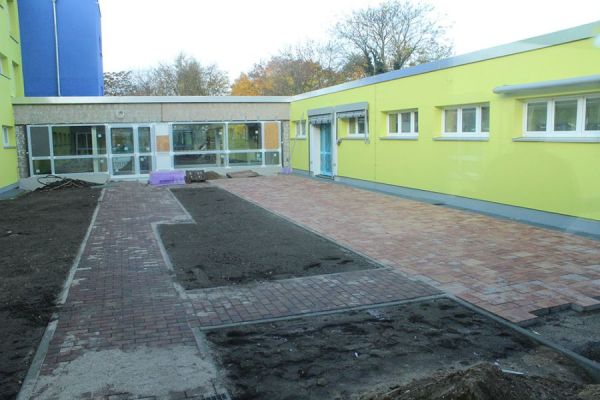 Im Innenhof zwischen den beiden Verbindungsgängen entsteht derzeit eine Außenterrasse, die später noch sonnengeschützt wird. Fotos: (Wsp) Phillipp